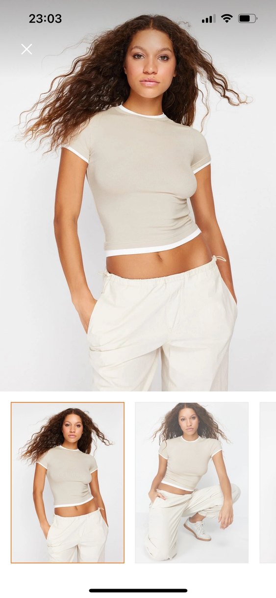 Bej renkli, pamuk kumaştan, kısa kollu ve bisiklet yaka crop top. İnce kesimi ve sade tasarımıyla günlük ve sokak stiline uygun, şık ve rahat bir parça.