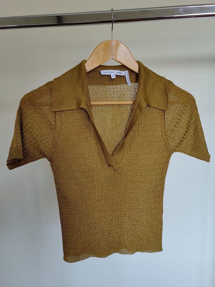 Kısa kollu, yakalı, triko kumaştan yapılmış bej renkli, parlak ve fitted kesim kadın gömleği. Günlük kullanıma uygun rahat bir sokak stili.
