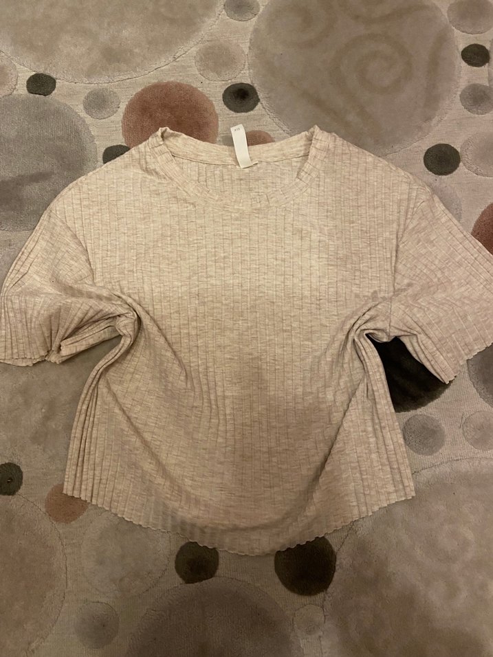 Bej renkli, kısa kollu, bisiklet yaka, keten kumaştan örülmüş, bol kesim kadın kazak. Normal midi boyda, desen içermeyen rahat bir tasarıma sahiptir.