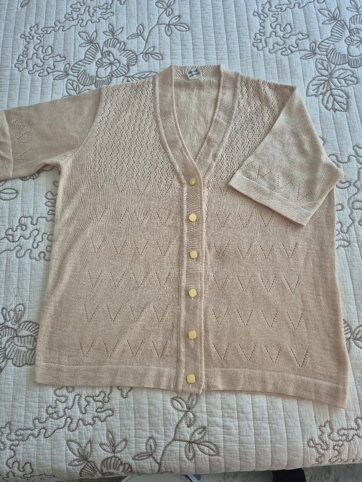 Bej renkte, kısa kollu ve V yakalı örgü hırka. Düğmeli ve bol kesim, kısa boyda, bohem tarzda rahat bir parça.