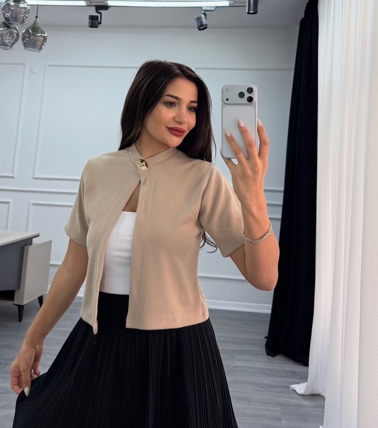Bej renkli, kısa kollu, V yaka ve düğmeli triko bluz, ofis için uygun modern ve regular fit kesime sahiptir. Bedenler mevcut