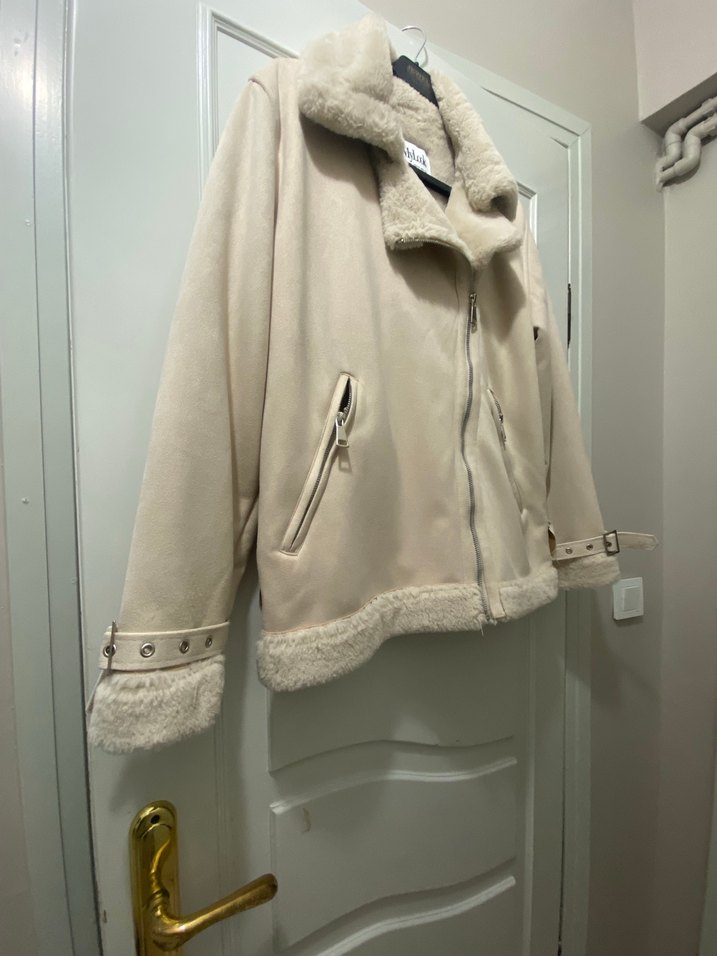 Bej renkli, kısa boy ve bol kesim kadın mont. Uzun kollu, yakası, manşetleri ve etek ucu kürklü, yumuşak ve sıcak kumaştan yapılmış. Casual tarz için uygun.