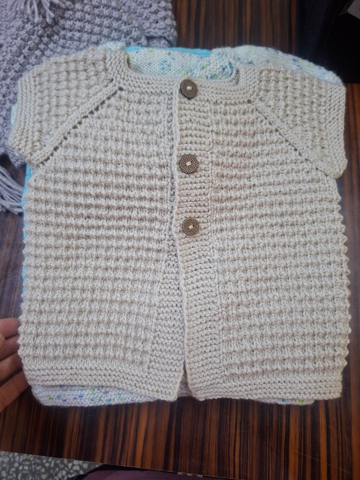 Bej renkli, kısa ve örgü dokulu, düğmeli, kolsuz bebek yeleği. Rahat kesimi ve yuvarlak yaka detayıyla günlük kullanım için uygundur.