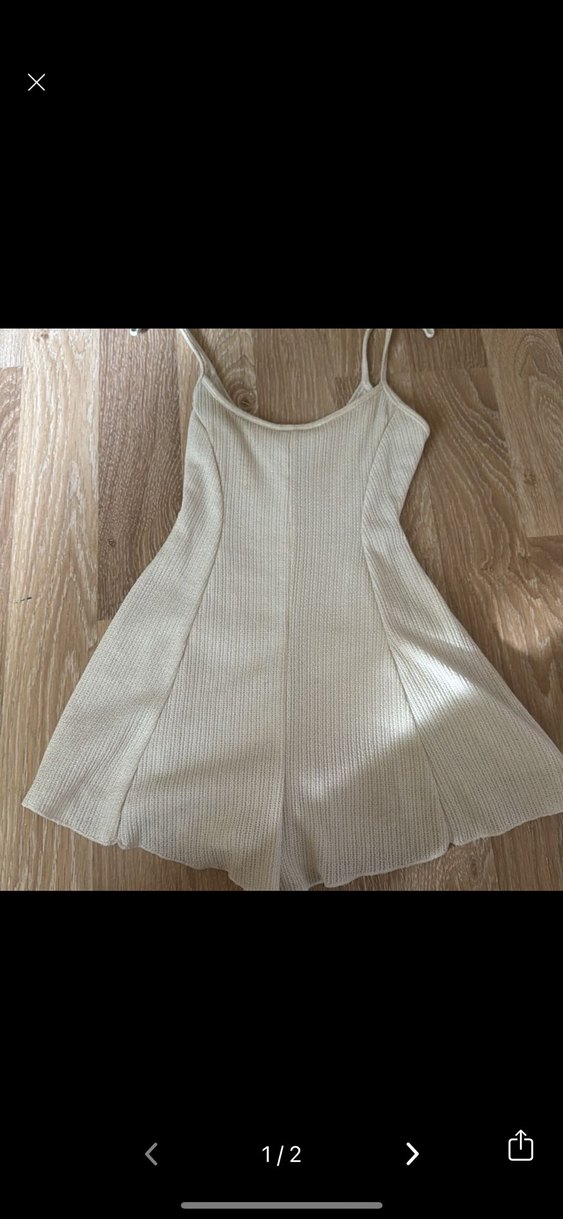 Bej renk, askılı ve straplez kadın tulumu, örme keten kumaştan üretilmiştir. Mini kısa ve vücuda oturan kesime sahiptir, sade ve rahat tarzda günlük kullanım için uygundur.