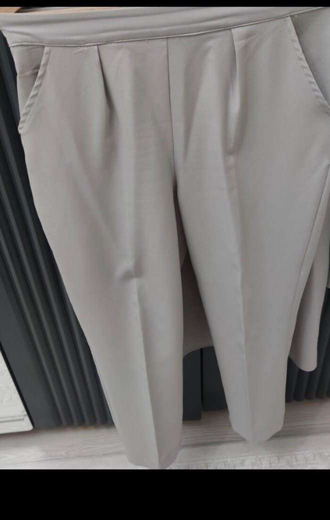 Bej renkli, kısa paça, pileli kadın kumaş pantolon. Regular fit kesim, minimalist sokak tarzı ve ofis kullanımı için uygun. Ikılı takım tesettür