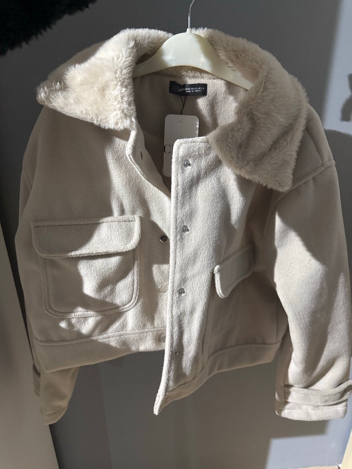 Bej kısa uzun kollu ceket, tüylü yakası ve bol kesimi ile rahatlık sunar. Ön cepli ve çıtçıtlı kapama detayına sahiptir, günlük kullanıma uygundur.