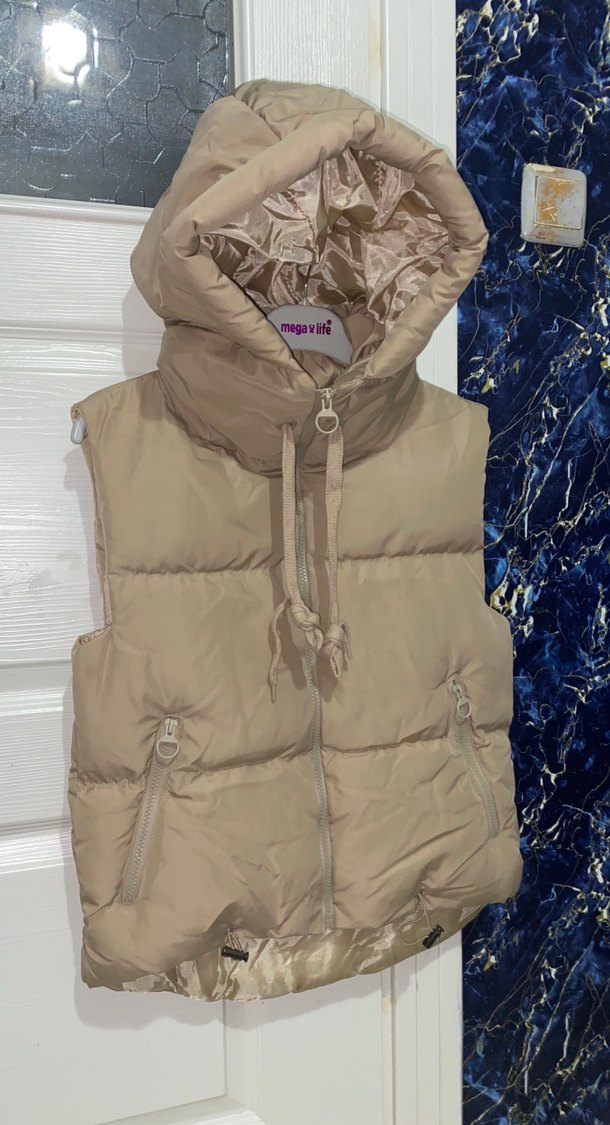 Bej renkte, kısa kesim ve sıfır kollu, yüksek yakalı şişme yelek. Fermuarlı cepleri ve dar kesimiyle rahat sokak stiline uygun.