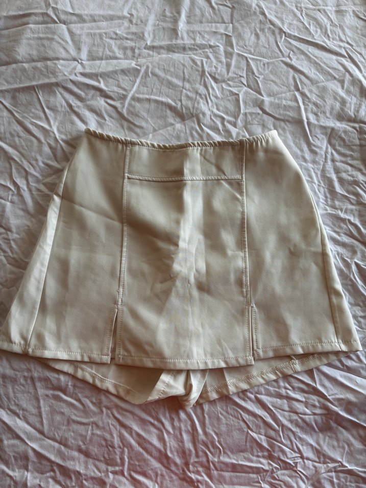 Düz bej renkli, sentetik kumaştan yapılmış ve kısa kesim olan bu deri şort, minimalist ve sokak stiline uygun, rahat bir şıklı sunar.