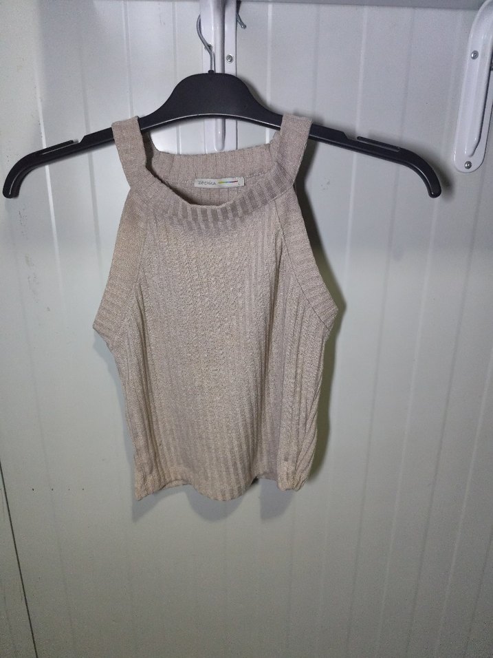 Bej renkli, kısa kesim ve yüksek yakalı, triko dokuma kadın atlet. İnce ve vücuda oturan kesimiyle günlük rahat sokak stili için uygundur.