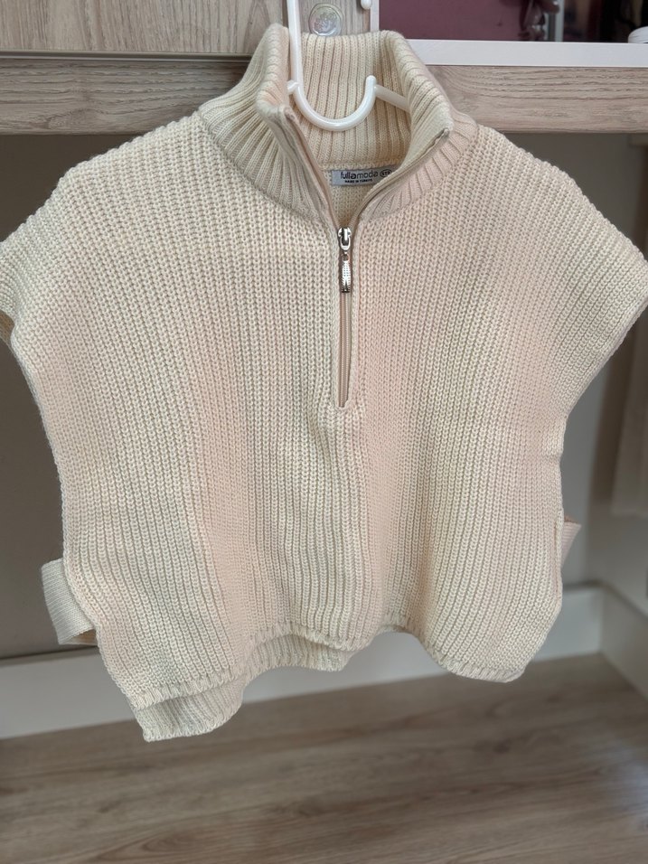 Bej renkte, kısa ve yarım fermuarlı boğazlı, örme dokulu süveter. Salaş kesimi ve kolsuz tasarımıyla rahat bir stil sunar. Günlük kullanıma uygundur.