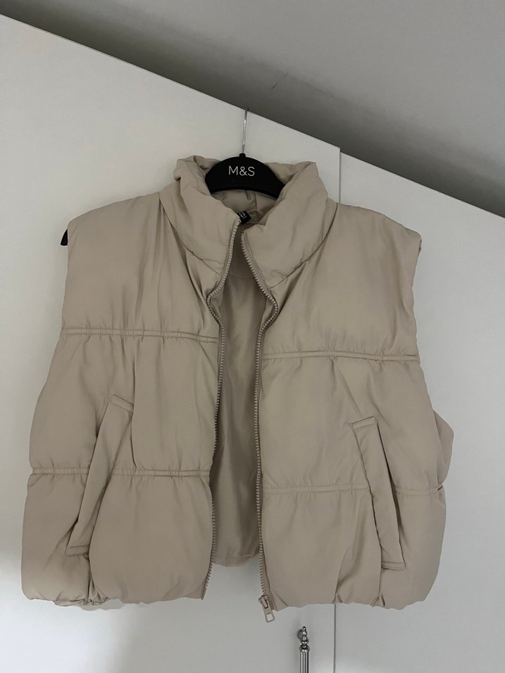 Bej kısa yelek, yüksek yakalı ve kemerli. Kolsuz, vücuda oturan kesim, günlük rahat kullanım için uygun. Desensiz, trend sokak stili.