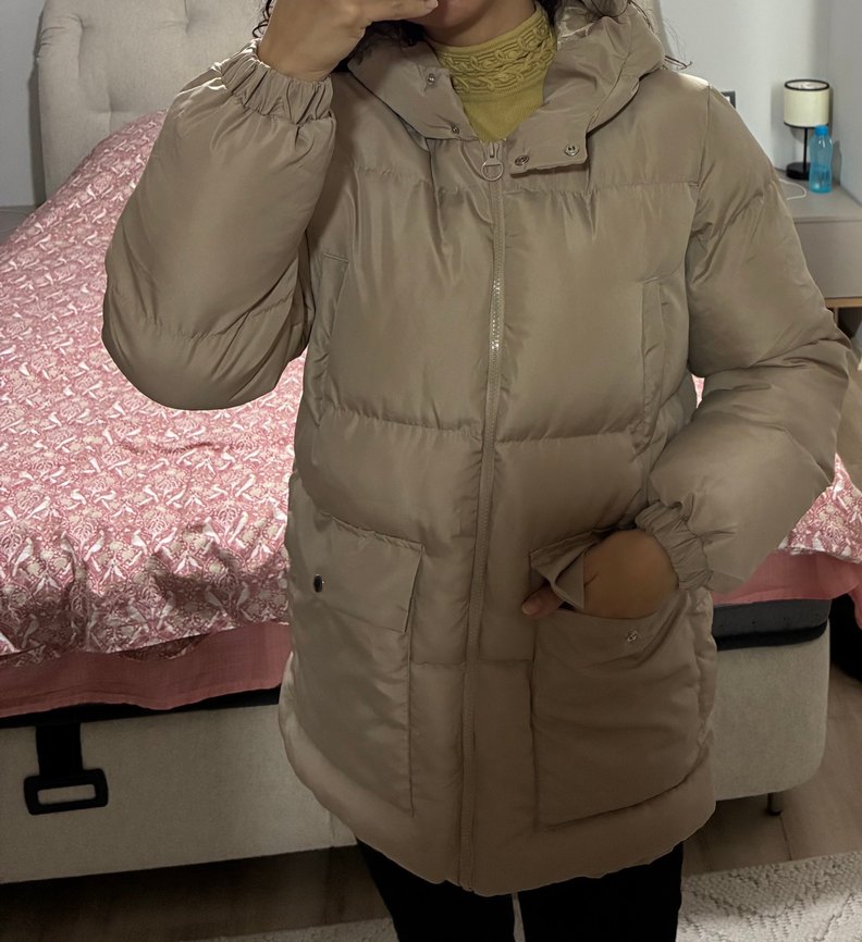 Bej renkte, düğmeli ve uzun kollu kadın kışlık mont. Orta boy ve yakası kesimli. Rahat sentetik kumaştan, gündelik kullanıma uygun. Hiç kullanmadım 38 beden ama daha büyük oversize kesim 40-42 beden tercih edebilir iadeyle uğraşmamak için satiyorum.