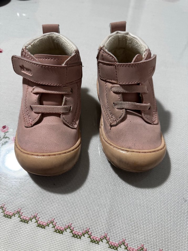 Bej renkli, kauçuk tabanlı kız bebek ilk adım ayakkabısı, yumuşak pastel tonlarda ve velcro bantlıdır.