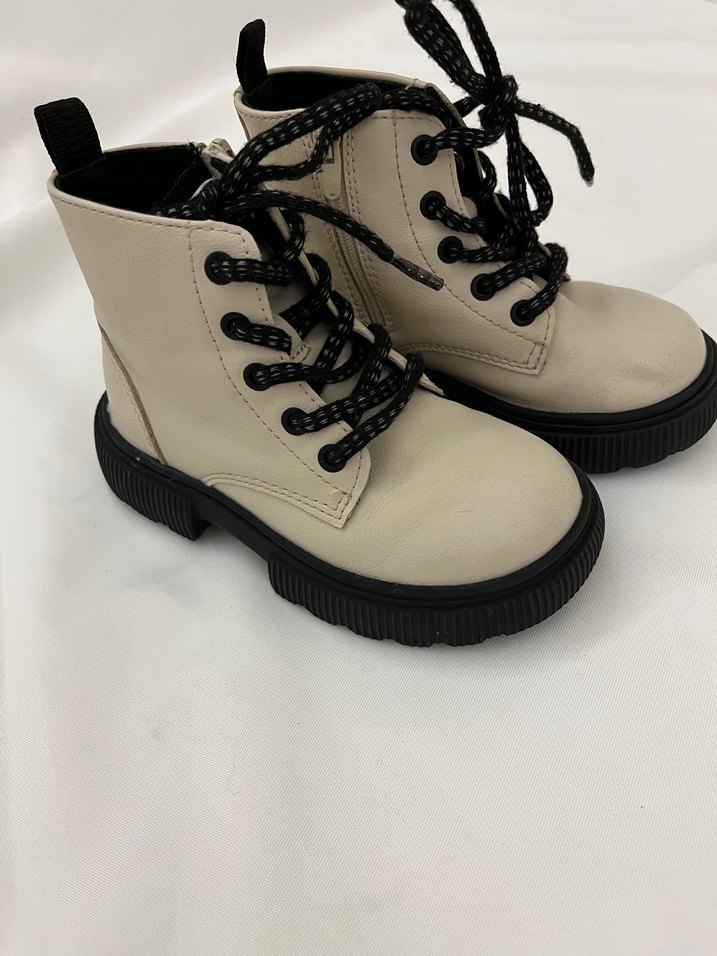 Bej renkli kız çocuk botları, lastikli yan detaylı ve siyah bağcıklı, düz tasarımlı ve sokak stiline uygun.
