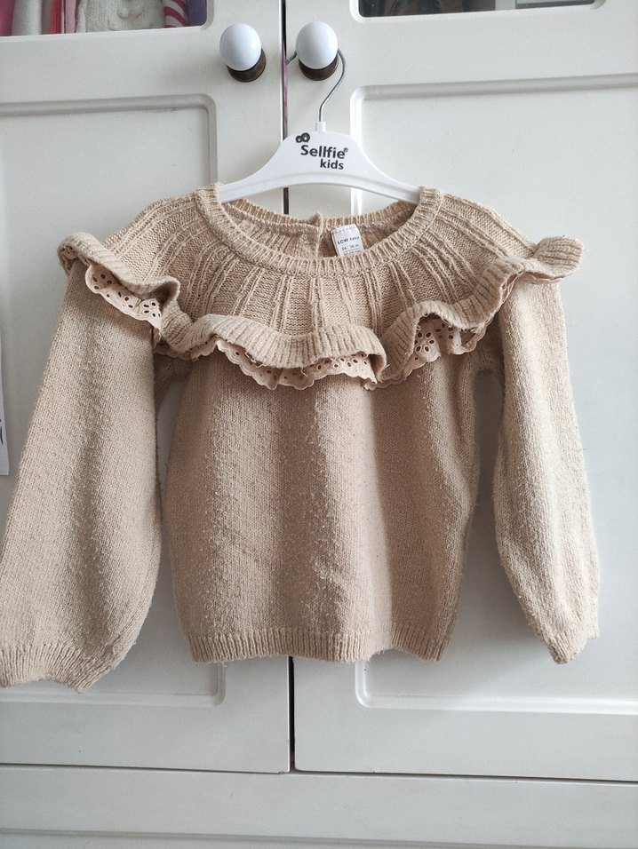 Bej renk, uzun kollu, yuvarlak yaka, nakış detaylı ve bohem fırfırlı kız çocuk triko kazak.