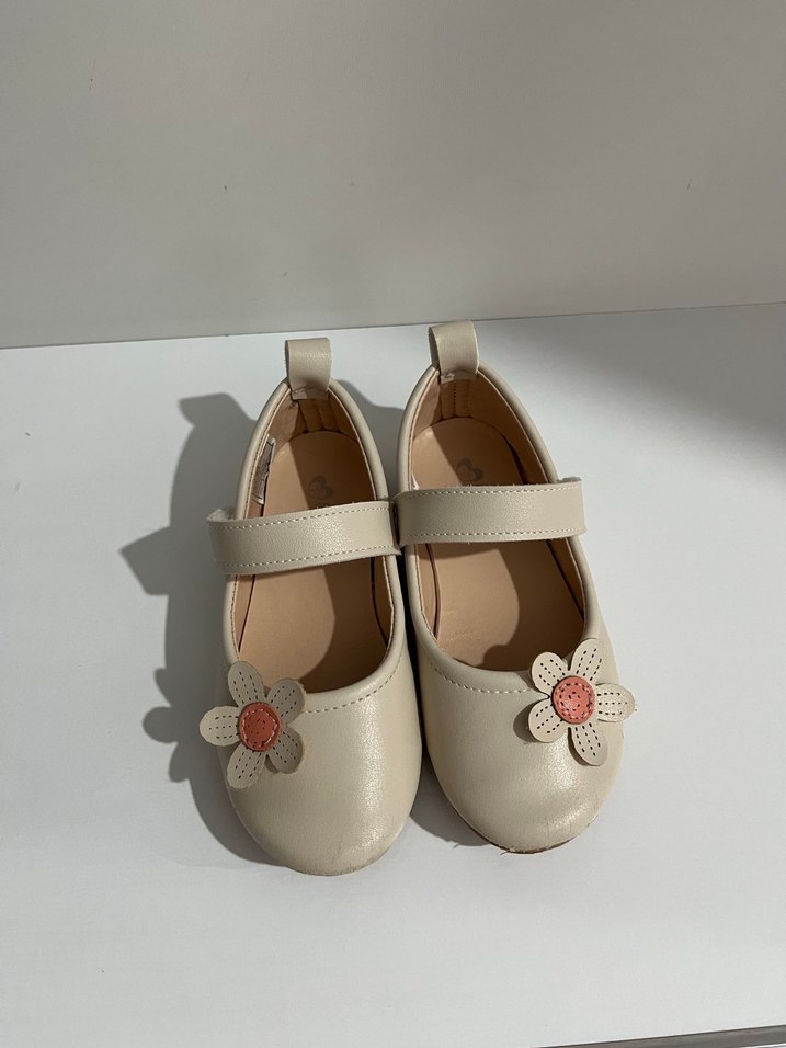 Hafif bej renkli, modern klasik tarzda kız çocuk babeti. Yumuşak kauçuk malzemeden, çiçek detaylı ve tokalı bantlıdır.