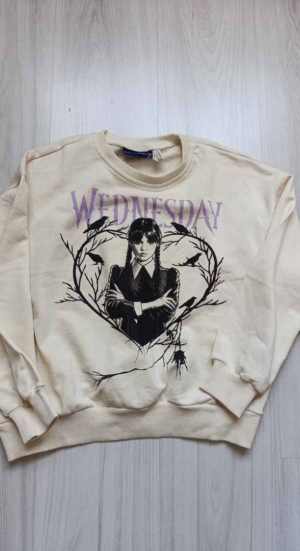 Bej renkte, pamuklu, uzun kollu ve bol kesim kiz çocuk ın sweatshirtü. Üzerinde 'WEDNESDAY' yazılı gotik baskı vardır. Yumuşak ve örme kumaştan, günlük kullanım için uygundur.