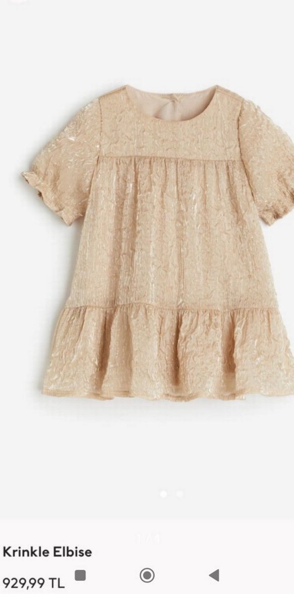 Keten kumaştan yapılmış, kısa kollu, fırfırlı ve nakışlı desenlere sahip bej renkli, bol kesim kız çocuk elbisesi, yuvarlak yaka ile klasik şıklık sunar.