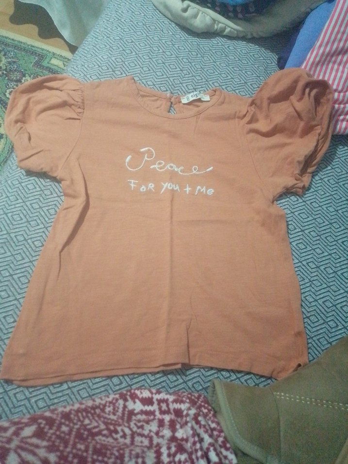 Bej renk keten kumaştan, bol kesim kız çocuk tişörtü. Kısa kabarık kollu, yuvarlak yaka ve düğmeli detaylıdır. Üzerinde "Peace" baskısı vardır.