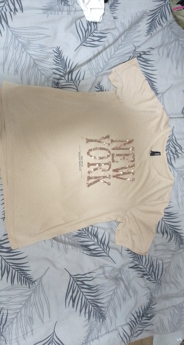 Bej renkli, kısa kollu ve yuvarlak yaka kız çocuk tişörtü. Pamuklu kumaştan, rahat kesim ve "NEW YORK" baskılıdır.