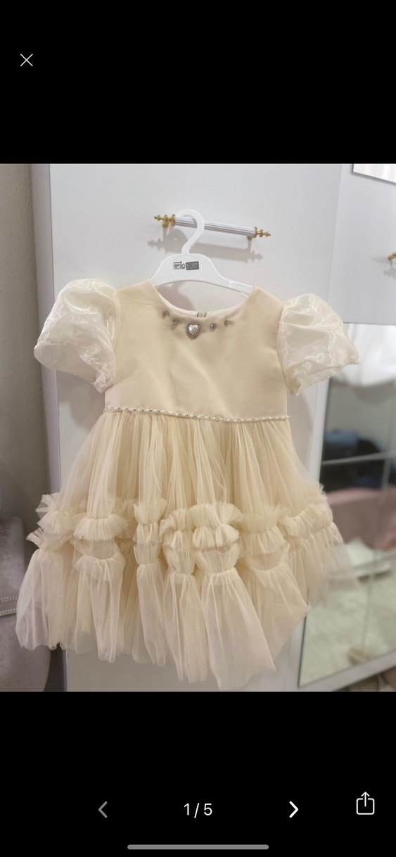 Kısa kabarık kollu, işlemeli ve fırfırlı detaylara sahip bej renk kız çocuk elbisesi. Yumuşak sentetik kumaştan, bohem pastel tarzda, dar kesim ve yuvarlak yaka.