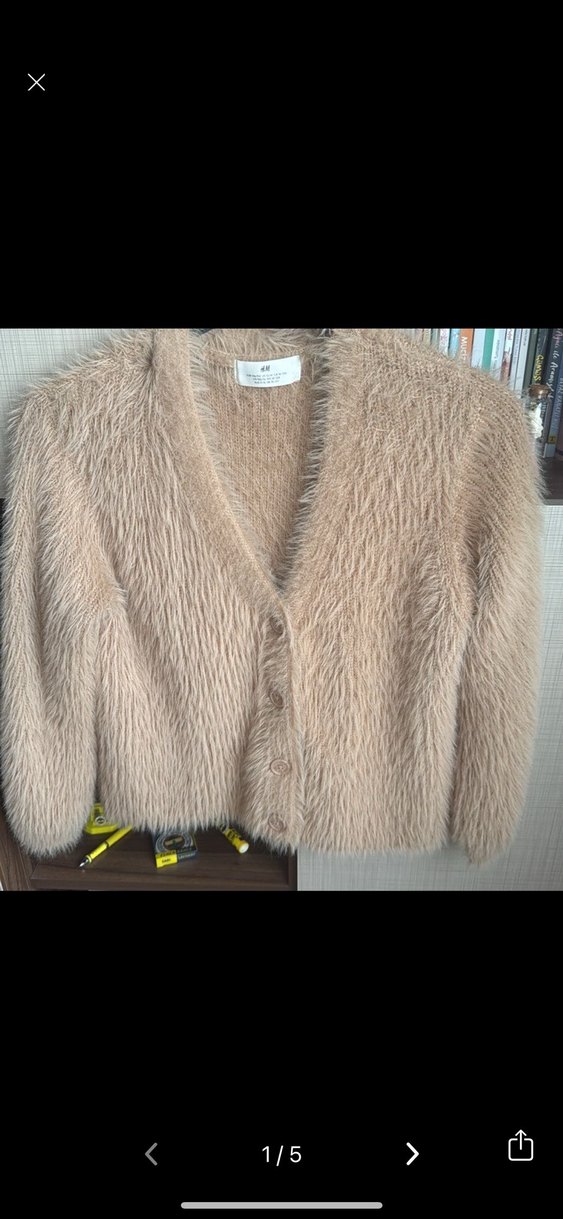 Bej renkte, kürk detaylı, triko kumaştan üretilmiş, normal boyda ve uzun kollu, yakası kesik yaka olan, günlük kullanıma uygun, rahat bir hırka.