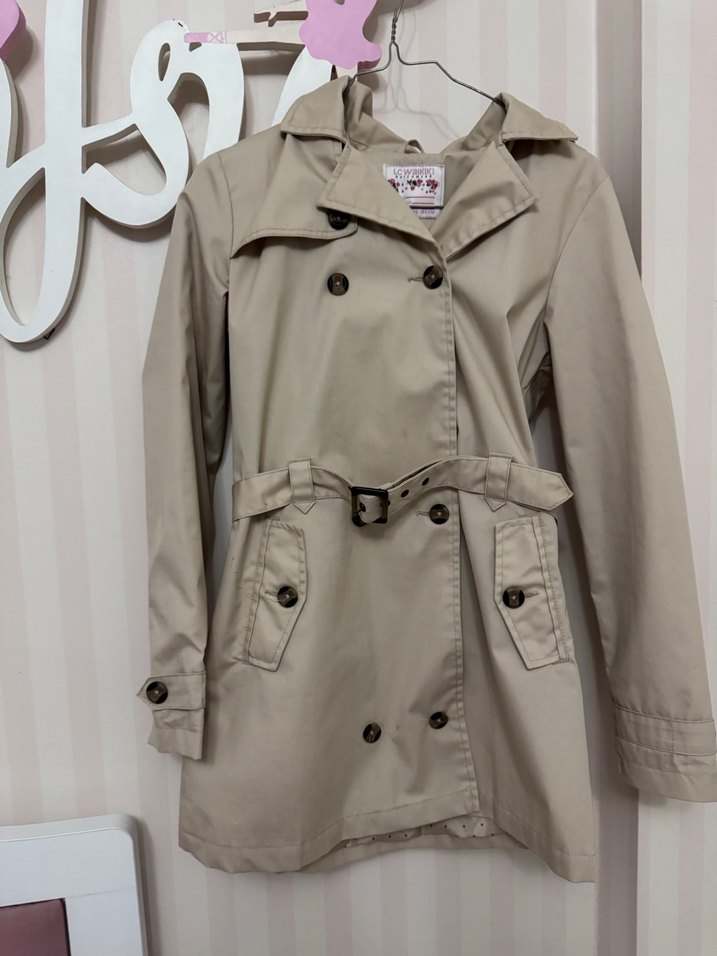 Bej renkte, düğmeli ve fitted kesime sahip midi trençkot. Notched yaka, askılı kollar ve belde kemer bulunur. Sentetik kumaştan, günlük rahat kullanıma uygun. Yeni durumda