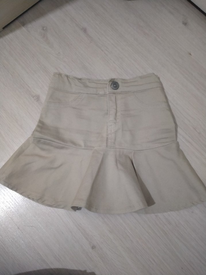 Bej renkli, keten kumaştan, pileli ve bol kesim kadın mini etek. Sokak stili ve trend görünüme uygundur. 5-6yaş