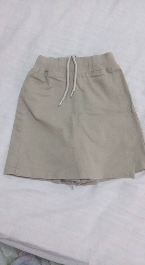 Bej renkli, rahat kesim mini etek, ayarlanabilir bağcıklı bel ve günlük kullanım için yumuşak sentetik kumaştan üretilmiştir.