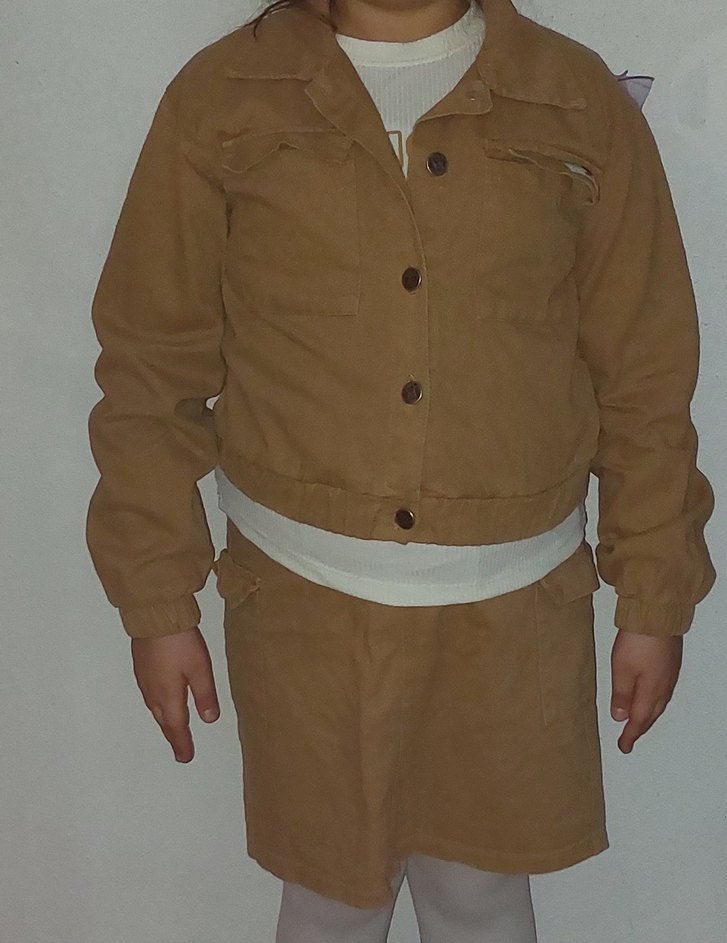 Bej renkte, düğmeli ve rahat kesime sahip, yumuşak süet kumaştan yapılmış, modaya uygun çocuk ceketi. ve eteği