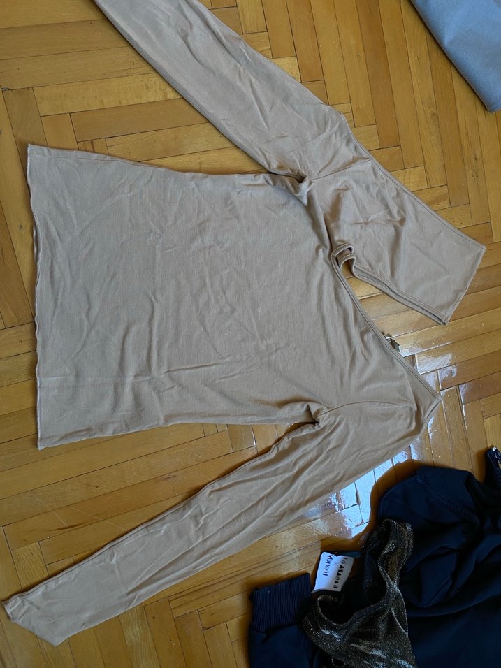 Bej renkte, balıkçı yaka ve uzun kollu, rahat keten kumaştan yapılmış, normal midi boyda, sade ve günlük kullanıma uygun bluzu.