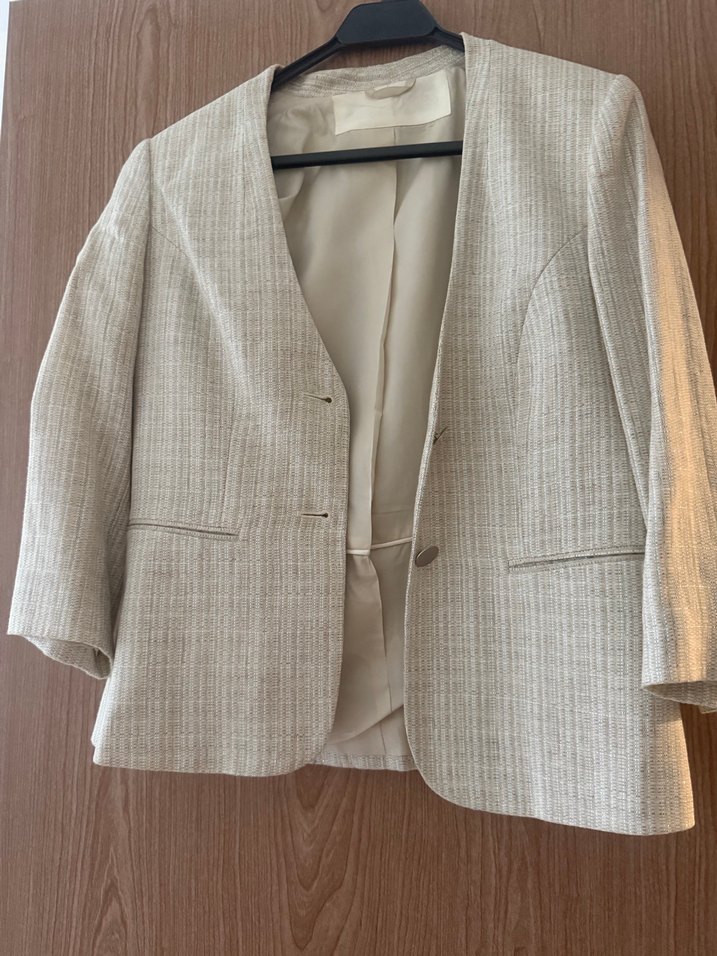 Bej renkli, keten kumaştan yapılmış, düğmeli ve uzun kollu klasik kesim kadın blazer ceket. Ofis kullanımı için uygundur.
