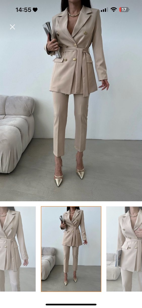 Bej düz kesim kumaş pantolon ve ceket klasik ve rahat bir görünüm sunar. Ofis kullanımı için uygun, hafif ve şık bir kumaştan üretilmiştir. ✨