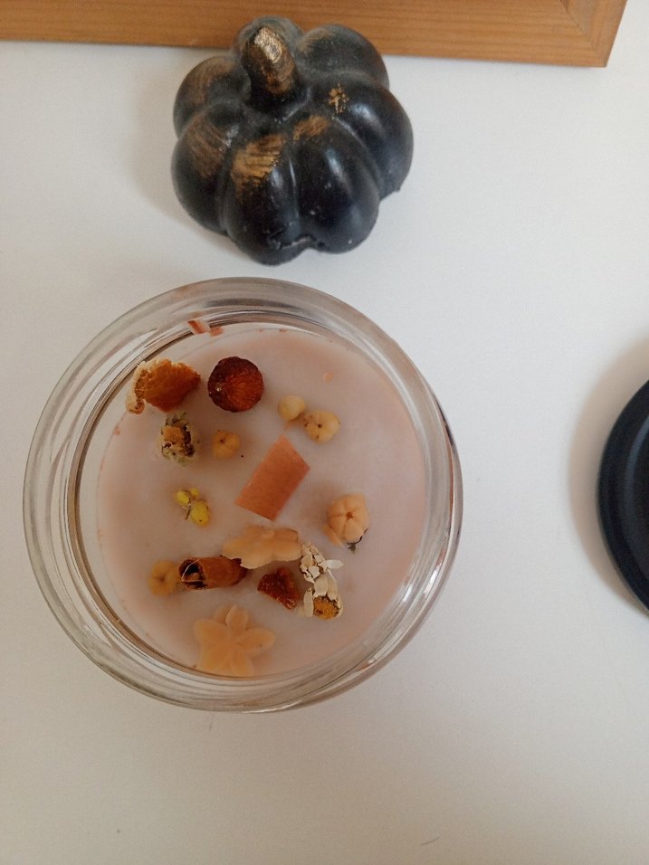 Bej renkte, doğal süslemelerle cam kabında kokulu mum tamamen el yapımı ve doğal koku larla zenginleştirilmiş , ilk yakımı için sizleri bekliyor Güvenle sipariş verebilirsiniz