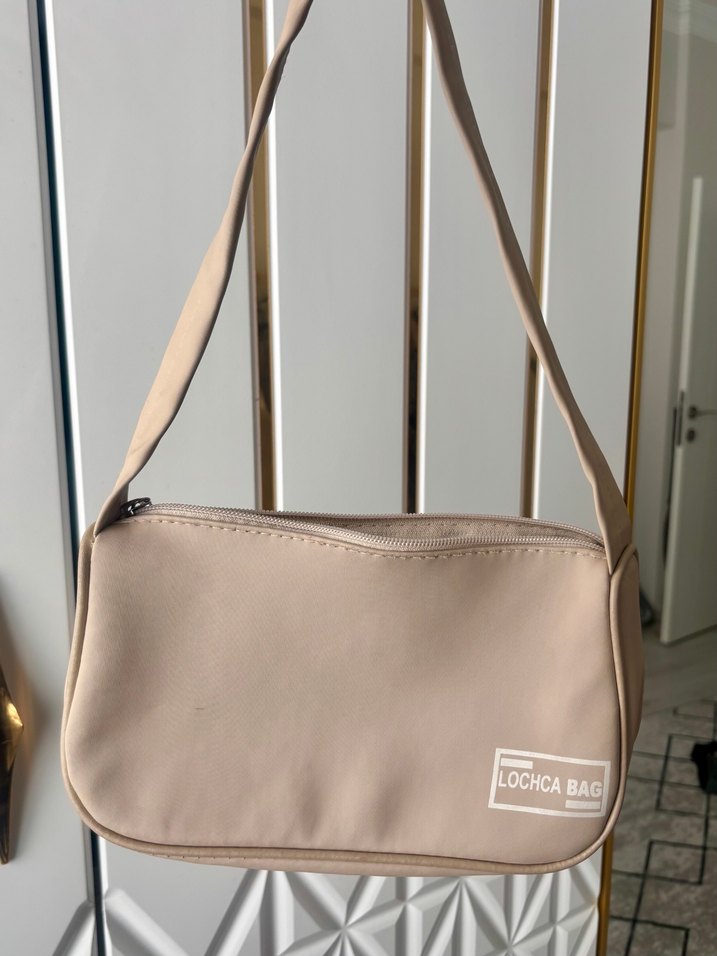 Bej renkte, desen içermeyen minimalist kadın çanta. Uzun askısı ve önünde LOCHCABAG yazısı bulunur. Günlük rahat ve şık stil için uygun. Minik bir defosu var.