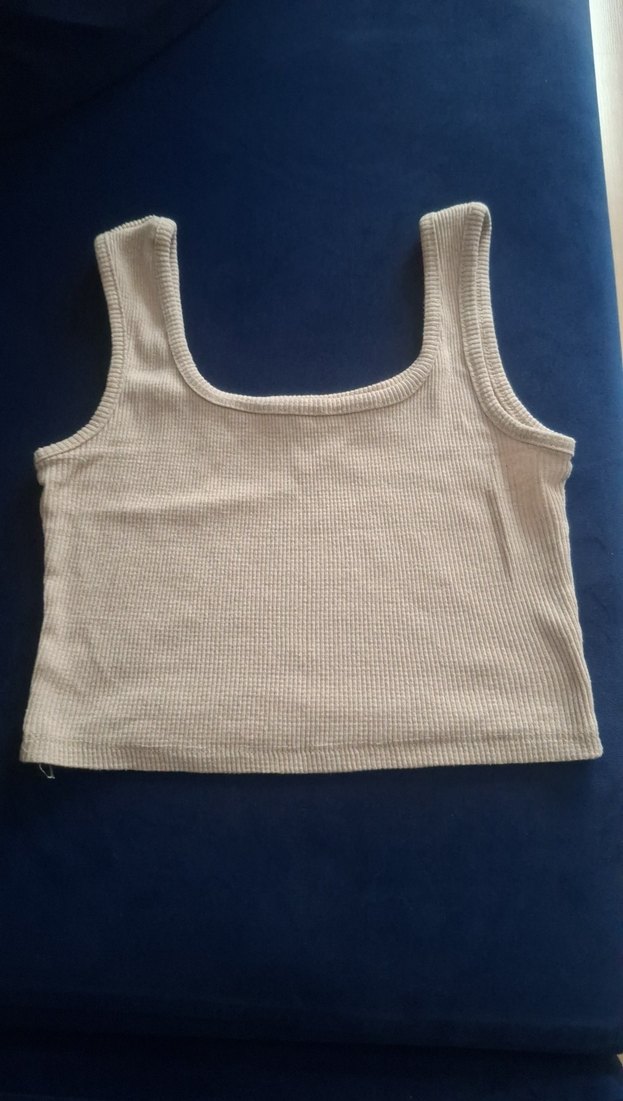 Bej renkte, kolsuz, tek renk basic crop top. Tekne yaka ve ince keten kumaşla sade ve şık bir görünüm sağlar.