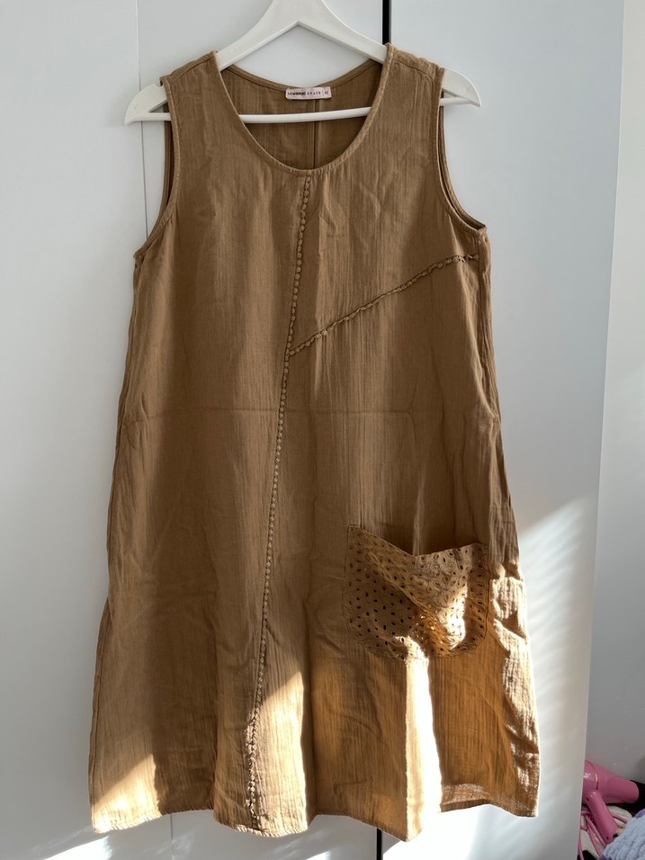 Bej renk, kolsuz, bol kesim keten elbise. Midi boyda, bohem tarzda, askısız yaka ve dokulu cep detayına sahip.