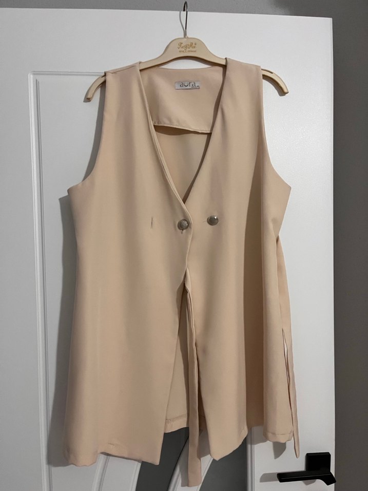 Bej renginde, kolsuz ve kısa boyda, düğmeli ve kesik yaka detaylı bu yelek, ofis ve günlük kullanıma uygun, rahat kesime sahip.