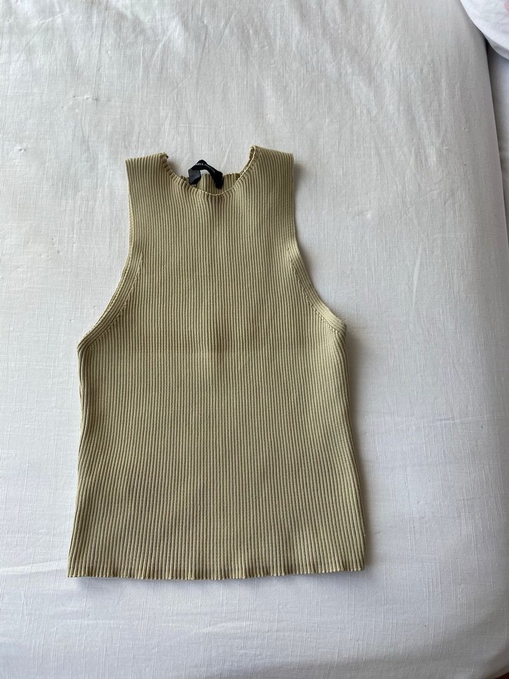 Kolsuz, bej renkli keten kumaştan, yüksek yakalı ve vücuda oturan kesime sahip. Minimalist, desen içermeyen tasarımıyla günlük sokak stiline uygun.