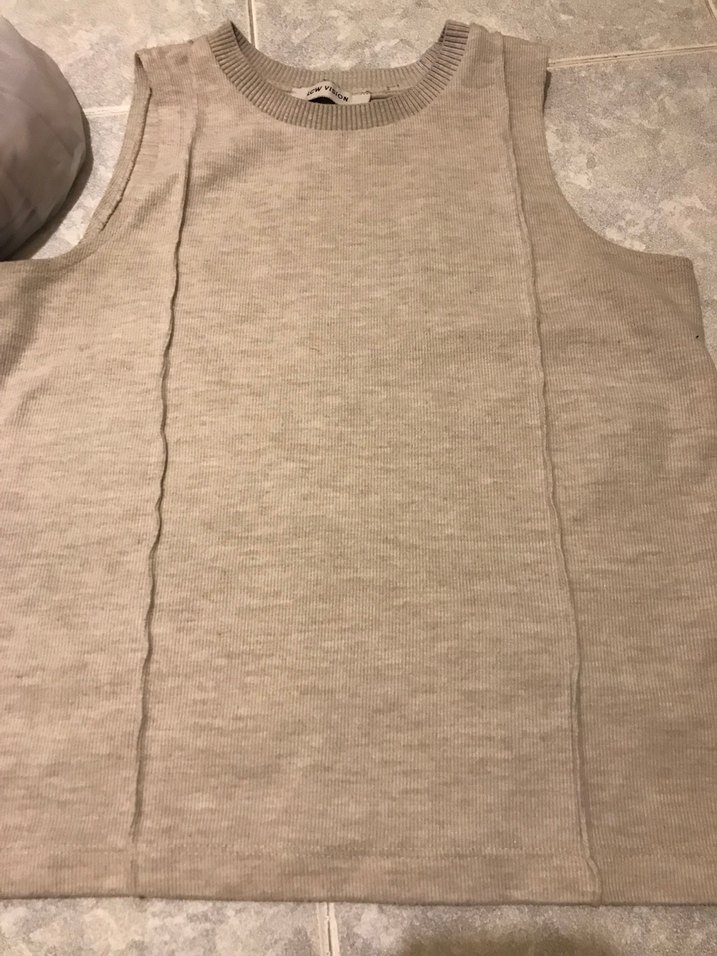 Bej renkte, keten kumaştan üretilmiş kolsuz kadın süveter. Yuvarlak yaka ve bol kesimiyle rahat bir günlük kullanım sunar.
