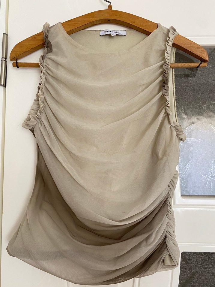 Bej renkli, keten kumaştan yapılmış, kolsuz ve drapeli tasarıma sahip uzun bluz. Ofis için uygun, bohem tarzda ve straplez yakalıdır.