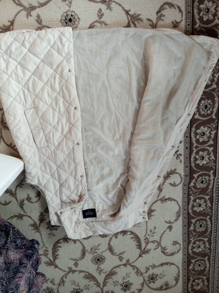 Bej renkli, kolsuz keten ceket, bol kesim ve yakalıdır. Düğmeli önü ve midi boyu günlük kullanım için uygundur.