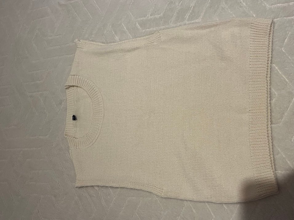 Bej renkli, kolsuz, keten dokulu triko süveter. Yuvarlak yaka ve bol kesim, günlük dış mekan kullanımı için uygundur.