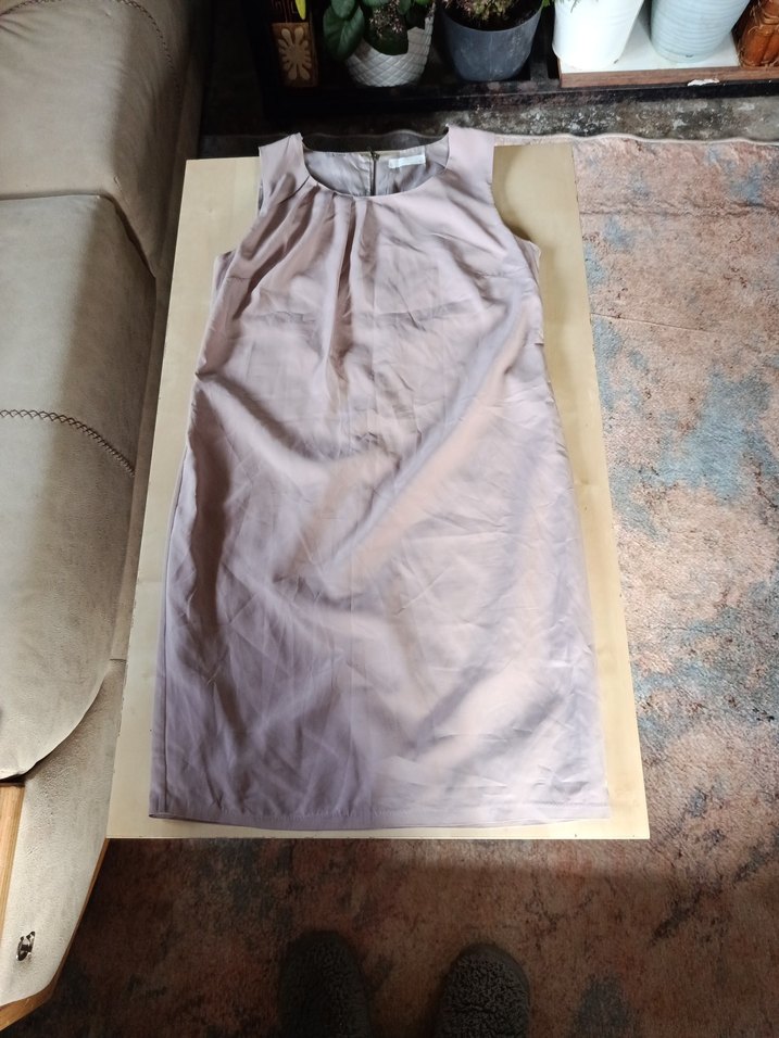 Yumuşak keten kumaştan, bej renkli, kolsuz, yüksek yakalı ve drapeli. Günlük kullanıma uygun, minimalist tarzda, normal kesim.