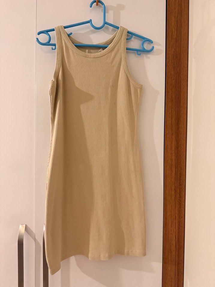 Yumuşak keten kumaştan yapılmış bej kolsuz midi elbise. Askısız yaka ve vücuda oturan kesimiyle minimalist sokak stili sunar. Günlük kullanım için uygun.