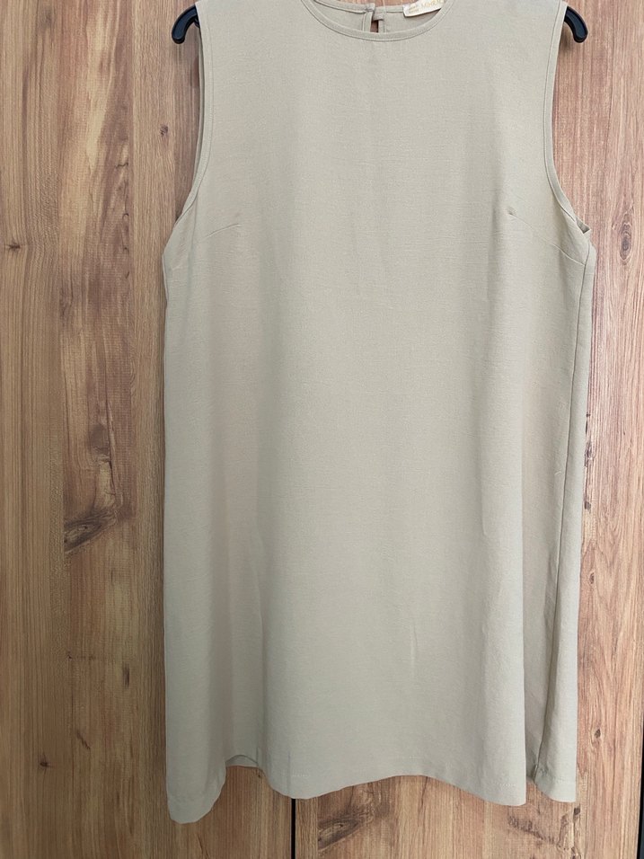Bej renkte, kolsuz ve rahat kesimli, yuvarlak yakalı midi tunik. Yumuşak keten kumaştan yapılmış, desen içermeyen sade tasarım, günlük kullanım için uygundur.