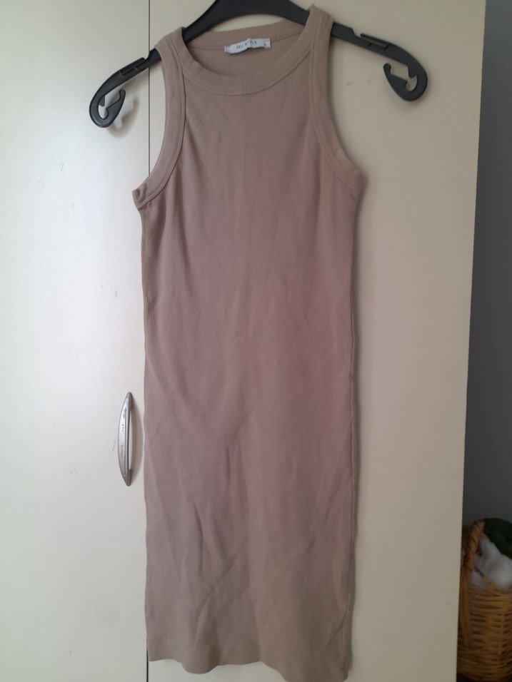 Bej Kolsuz Midi Karkoşe Elbise