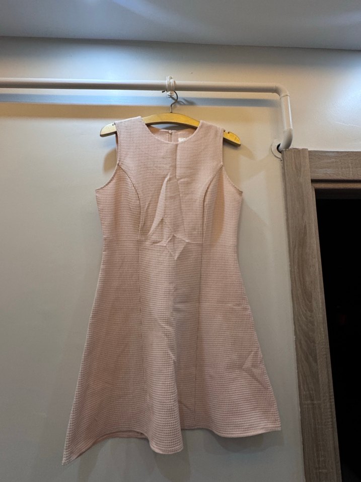 Yumuşak kumaştan yapılmış, kolsuz, bej midi elbise. Yüksek yakalı ve pile detaylı, minimalist tarzda günlük kullanıma uygun