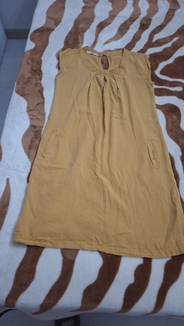 Bej kolsuz midi elbise, gevşek kesim ve V yakaya sahip, hafif keten kumaştan rahat ve sade bohem stil sunar. Ön cepleri bulunur.