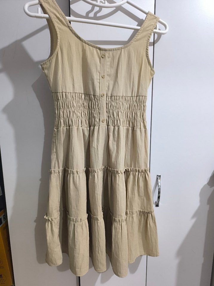 Bej keten kumaştan, kolsuz ve askılı, straplez görünümlü, fırfırlı detaylı midi boy elbise. Bohem ve retro tarzda, günlük kullanım için uygun.